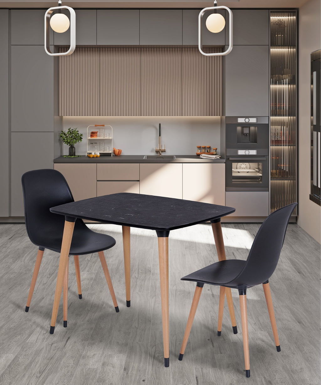 70x90 Siyah Mermer Desenli Masa ve 2 Siyah Sandalye Takımı Ahşap Ayaklı | Fabrikadanal.net