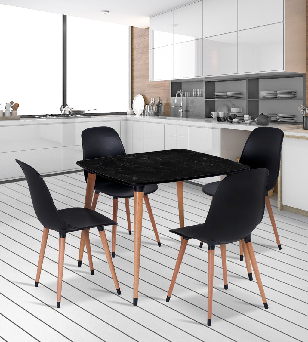90x90 cm Siyah Mermer Desenli Masa ve 4 Siyah Sandalye Takımı Ahşap Ayaklı | Fabrikadanal.net
