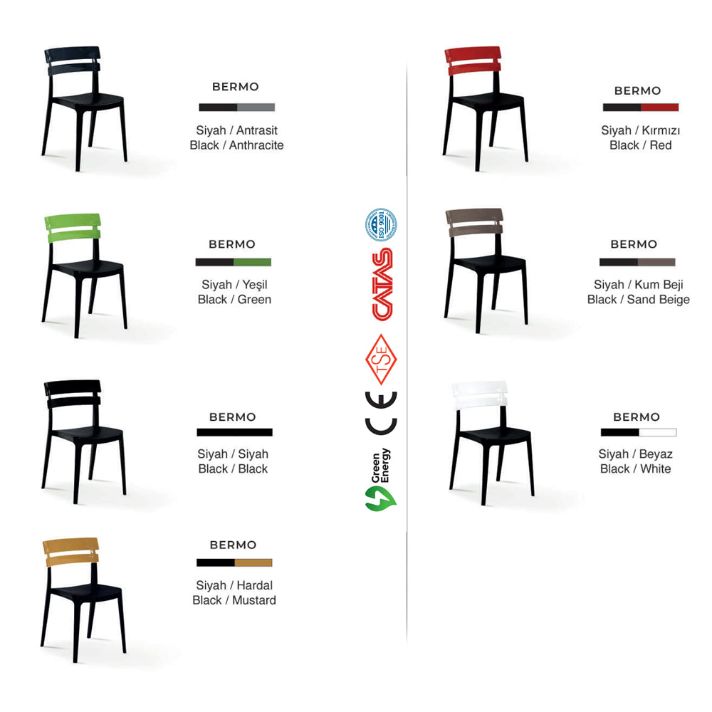 Çift renkli modern tasarımı sayesinde hem iç mekanlarda hem de dış mekanlarda estetik bir görünüm oluşturur. Bermo sandalye; dayanıklılığı, konforu ve şıklığı bir arada sunarak kafe, restoran, bahçe ve teras gibi alanlar için ideal bir tercihtir.