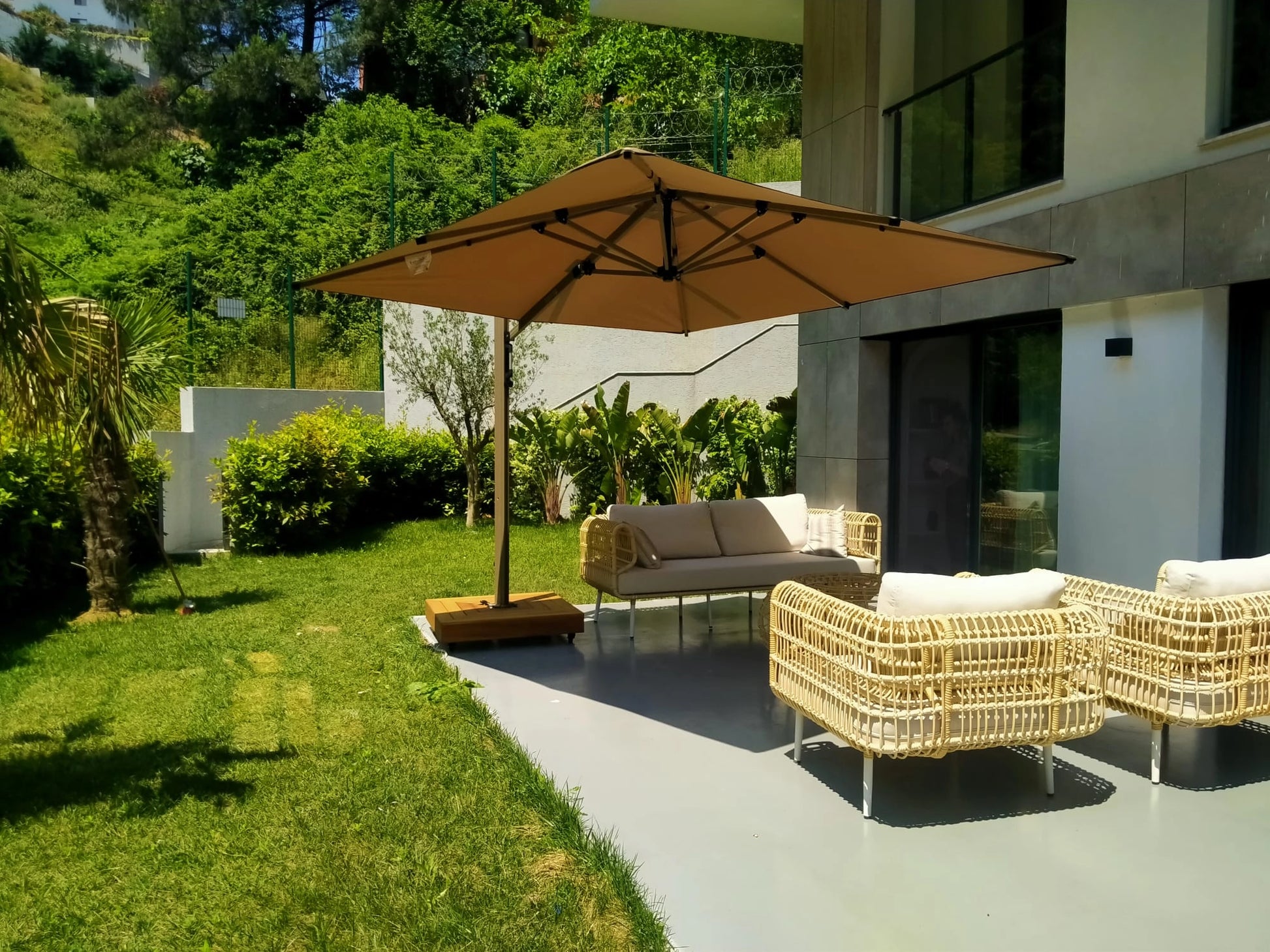 Rodos şemsiye, yandan direkli tasarımıyla 9m2 alanı güneş ve olası yağmurlardan koruyarak keyifli anlarınıza eşlik eder. Pratik ve sorunsuz kullanım vizyonu ile sizlere sunulan modelimiz, kolay kullanıma sahip gizli makara sistemi ile çalışan çevirme kolu aracılığıyla oldukça basit şekilde açılıp kapanabilmektedir.
